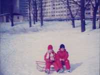 Gordana (Goga) Aničić u šetnji Srednjacima s jednogodišnjom kćerkom Dinkom. Fotografija je snimljena u rano proljeće 1982. godine u parku u centru naselja. U pozadini se vidi zgrada u Ulici Rudolfa Hercigonje, danas Ulici Vladimira Filakovca, kao i neboderi na Knežiji. Goga je rođena 12. 1. 1956. godine u Karlovcu. Osnovnu školu pohađala je u Beogradu gdje se obitelj preselila zbog očevog posla. 1970. godine vraćaju se u Hrvatsku i počinju živjeti na Srednjacima u Ulici Rudolfa Hercigonje 17. Goga, tada srednjoškolka, upisuje IX. gimnaziju u Dobojskoj ulici. Nakon završenog Ekonomskog fakulteta ostaje živjeti na Trešnjevki, na Gredicama i Knežiji.