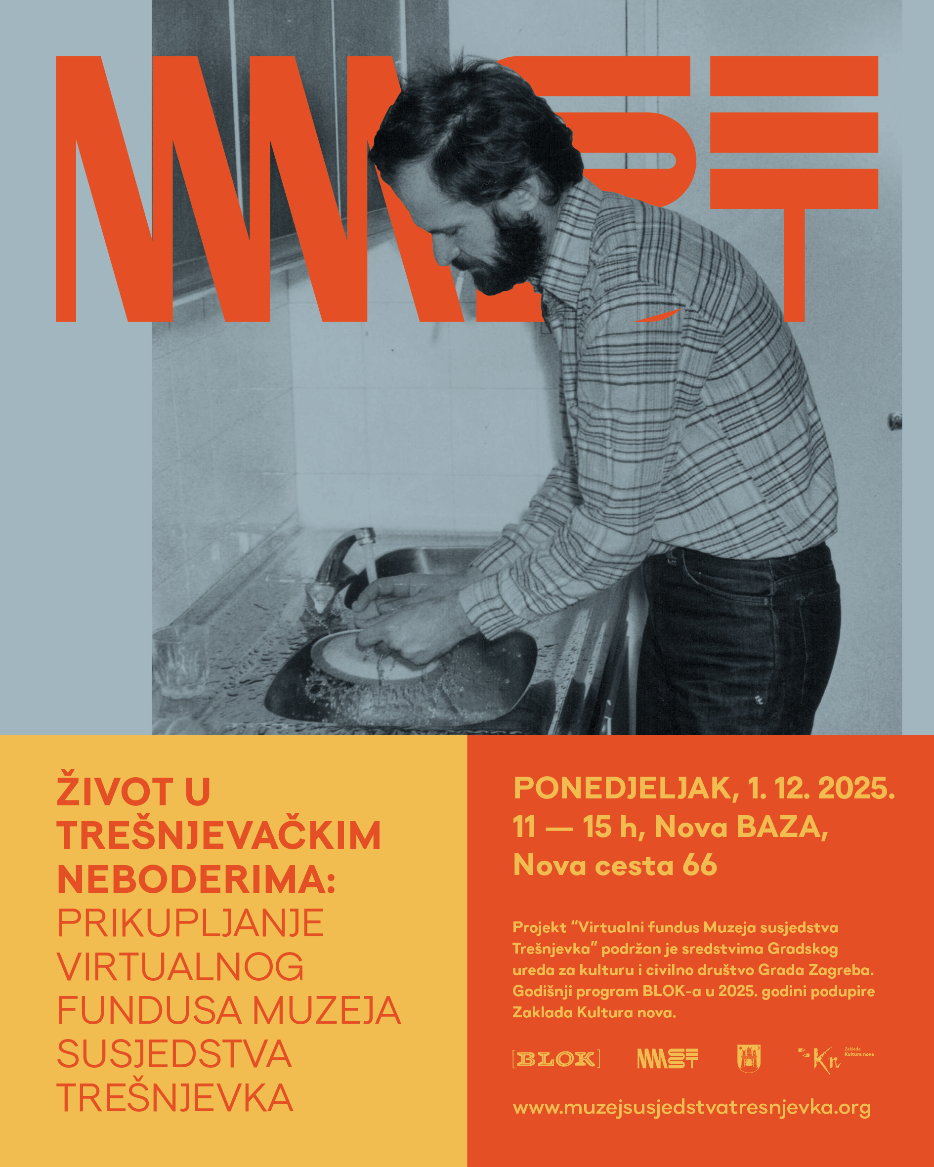 Od 20. studenog do 13. prosinca u galeriji Nova BAZA možete pogledati izložbu “Vertikalni život” umjetnice Maje Marković i povjesničarke umjetnosti Lidije Butković Mićin o neboderima u Ulici braće Domany na Srednjacima. Za to vrijeme, nastavljamo otkrivati i prikupljati priče iz trešnjevačke povijesti u našem virtualnom fundusu. Nije bitno živite li u nekoj od trešnjevačkih visokogradnji ili obiteljskoj kući, na Srednjacima ili Voltinom - zanimaju nas vaše uspomene na to kako se na Trešnjevci živjelo, školovalo, radilo, treniralo, družilo, šetalo, jelo. Čekamo vas u ponedjeljak 1. 12. od 11 do 15 h u Novoj BAZI (Nova cesta 66), gdje ćemo prikupiti vaše priloge i priče. Predmete ćemo snimiti na licu mjesta te vam ih odmah vratiti.